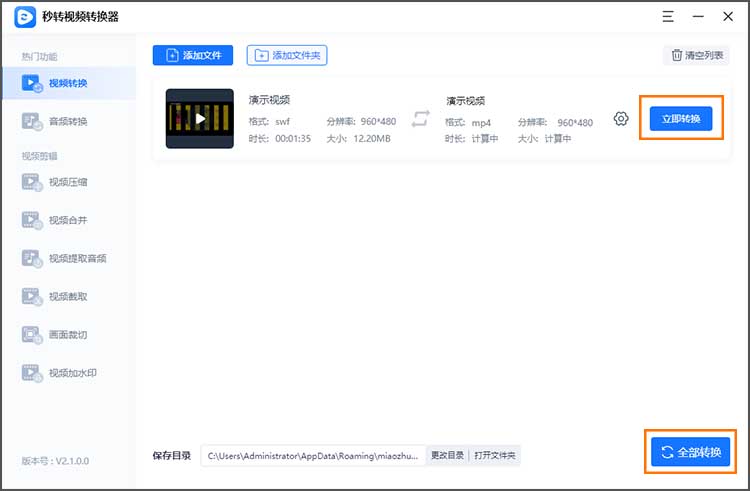 使用秒转视频转换器,可以将swf文件转换为mp4格式。这款软件的主要功能就是视频转换,可以兼容swf、mkv、mp4、mov、avi等多种视频格式,以满足不同需求。在转换时,它还支持批量导入,再一同转换,可以有效减少重复性操作。